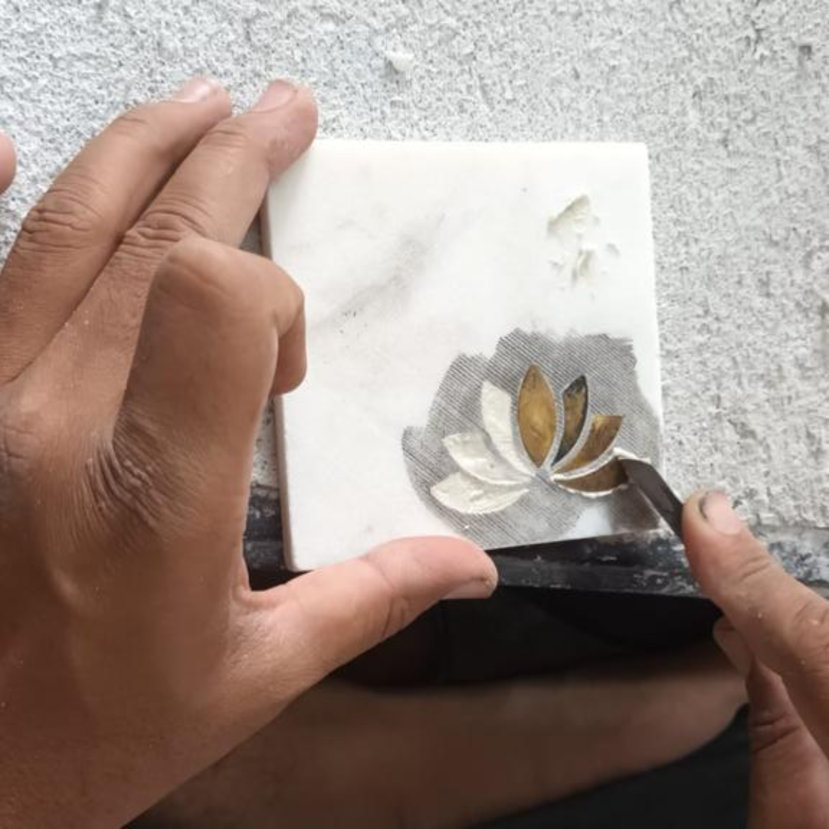 Marble Carving, a heritage craft from Agra, Uttar Pradesh, involves a meticulous process of chiseling and polishing marble to create intricate patterns and designs. Skilled artisans first hand-carve the marble using traditional tools, ensuring precision in every detail. The pieces are then finely polished to enhance the natural shine of the marble.